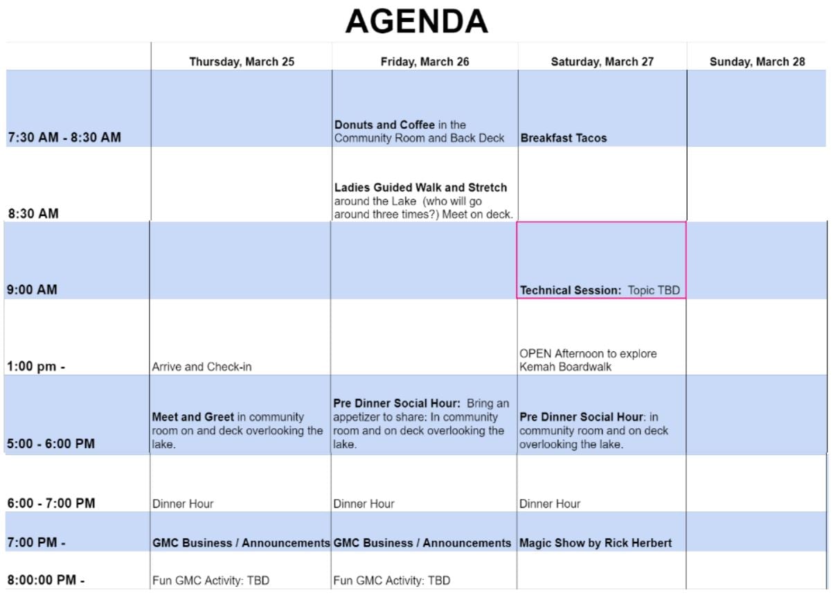 The GMC Classics Winter Rally will be at Stephen F Austin State Park, Wed, Jan 29th – Sun Feb 2nd (4 nights) in the Full Hook Up area (sites 1-40), which currently has 27 full hookup sites available. Please notify me when you make your reservation, providing me your site# and the number of attendees, so we can keep track of counts for meals.