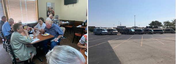 There were a total of 26 in attendance. Present were Robert & Marilyn Musgrove with daughter Rebecca Wetzler who was visiting from Alaska, Pat & Susan O'Brien, Fred & Peggy Pitezel, Ken & Doree Broostin, Don Cooper, Clark Southmayd, Jim & Betty Haynes, Clyde Jones, Larry & Joanna Potts, Monte & Helen Jestes, Geoffrey & Peggy Alexander, Bernie & Renee Baldwin, Shirley Pense, and Bob & Charlotte Ankershiel. We had an additional visitor, Julie Williams, who is the daughter of Steve Clevenger, a long time Tulsa GMC Lunch Bunch member. Steve passed away three years ago; and, his GMC motorhome is for sale now. The coach is a 23' 1976 Transmode (ex Birchaven) that is equipped with a bed and a table. An empty shell for all intents and purposes. Call Julie Williams at 469-978-4345 for more information. Ken Broostin gave an update on our planned foliage trip to the Broken Bow, OK area during the October 26th to 30th timeframe. Some GMC'ers may leave a day early; or, they may return a day later as their respective schedules allow. The plan is to stay in Hochatown State Park which does not take reservations. The tour of the Newell Coach Factory in Miami, OK on September 12th was an enjoyable and interesting experience. Some of us tried our luck at the Buffalo Run Casino where four coaches and eight GMCers spent the weekend; but, no one experienced the 'loosest slots' that is advertised. Seven GMCers drove up for the tour on Monday morning. Thanks to Chuck & Anne Meyers for providing the pancake and sausage breakfast before the tour. See you next month.